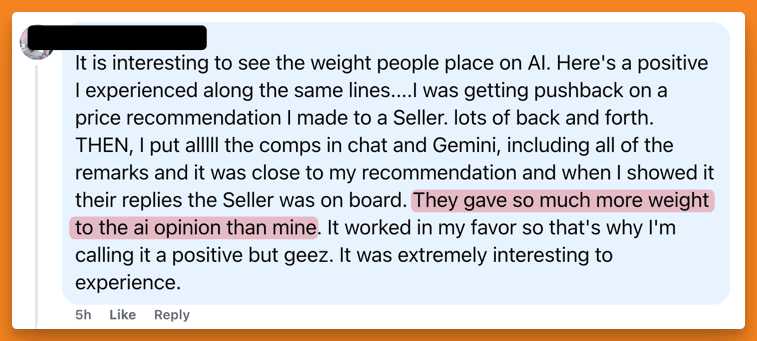 When I say "four times" above, that doesn't include this from an agent in my mastermind community about clients using AI: