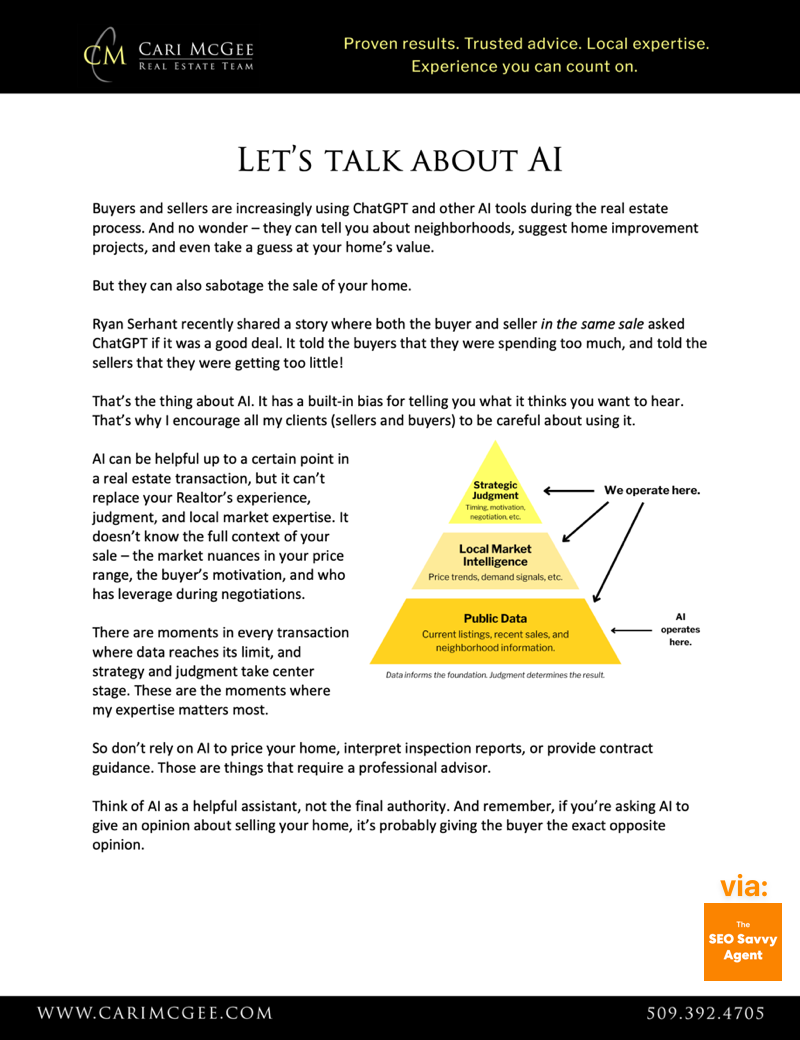 The time is now to educate, educate, and educate some more on the downfalls of relying on AI when they should rely on you. Feel free to use our listing presentation page above, customize it in your voice, and make sure your clients understand how and how not to use AI during a transaction.
