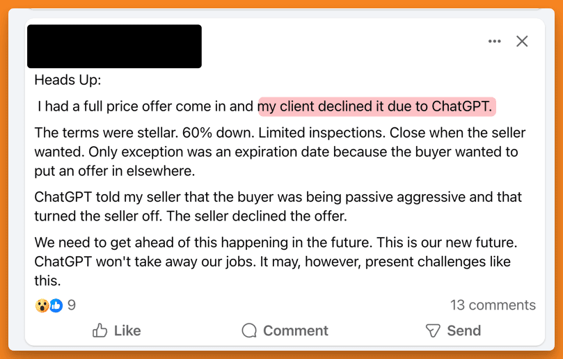 But AI is starting to ruin deals, like the story below about a homeowner who rejected a full-price offer because ChatGPT said the buyer was being "passive aggressive" by including a deadline in their offer. Let's take a closer look...