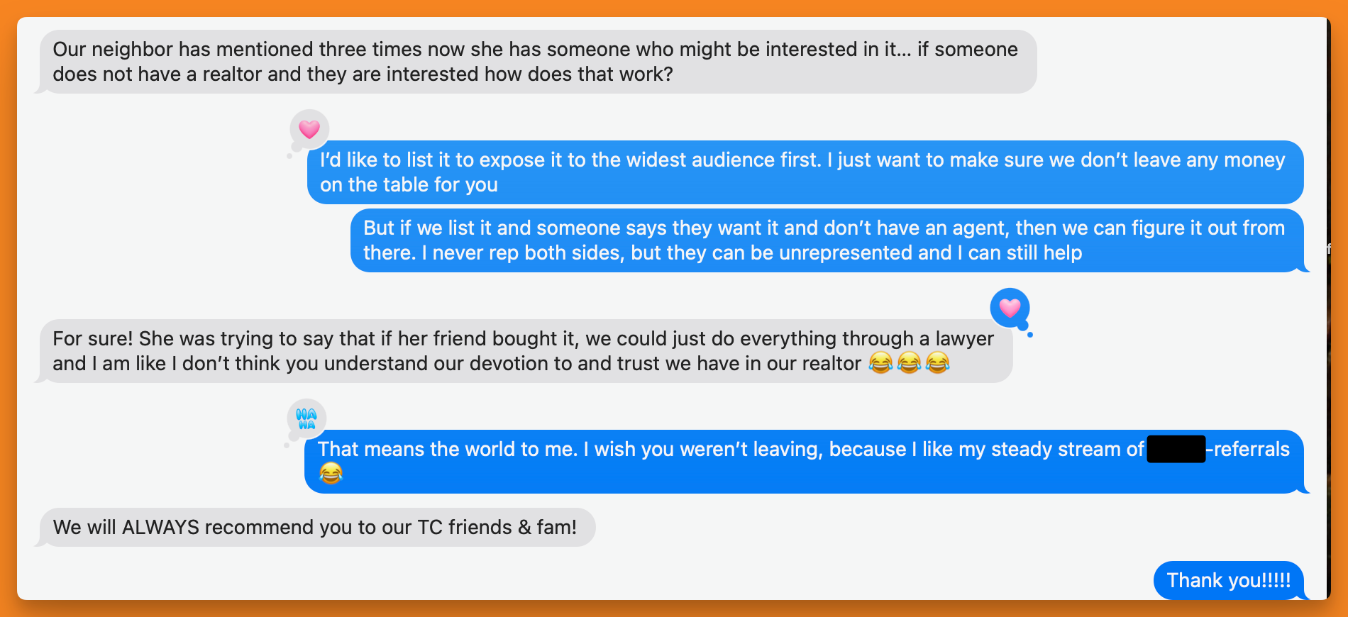 This is an actual text conversation that Cari had with one of her Forever Clients. The client was planning to sell and was approached three times by a neighbor whose friend wanted to buy their home off-market using a lawyer.